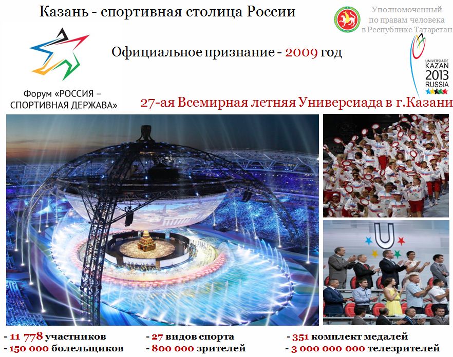 Столица Республики Татарстан, город Казань – пример города, чей спортивный потенциал, постепенно перерастающий в устойчивый бренд, был определен Правительством Республики Татарстан и поддержан не только населением региона, но и федеральными органами власти России.