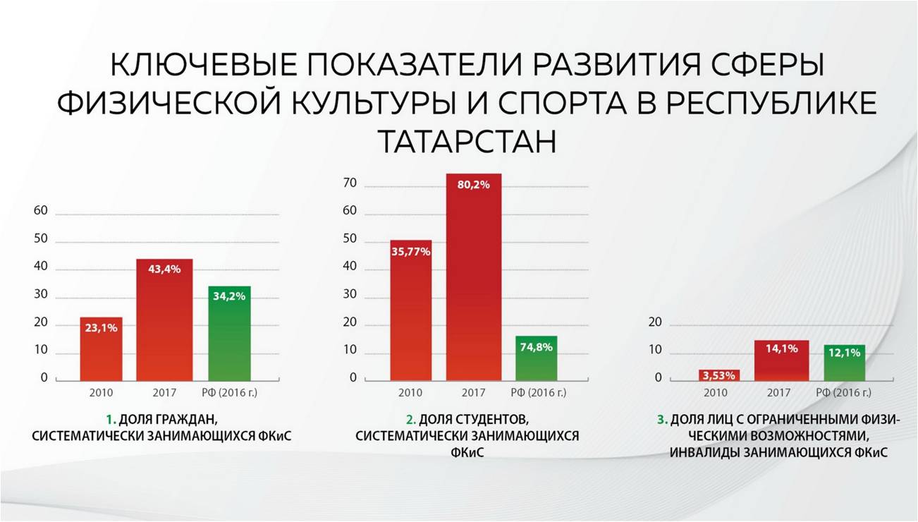 Таким образом, в Республике Татарстан спорт стал новой площадкой, объединившей представителей различных национальностей, этносов, конфессий, рас, социальных групп, стран и континентов, воспитывающей их в уважении друг к другу как к представителям одной большой семьи, придерживающейся и пропагандирующей здоровый образ жизни и занятия физической культурой.