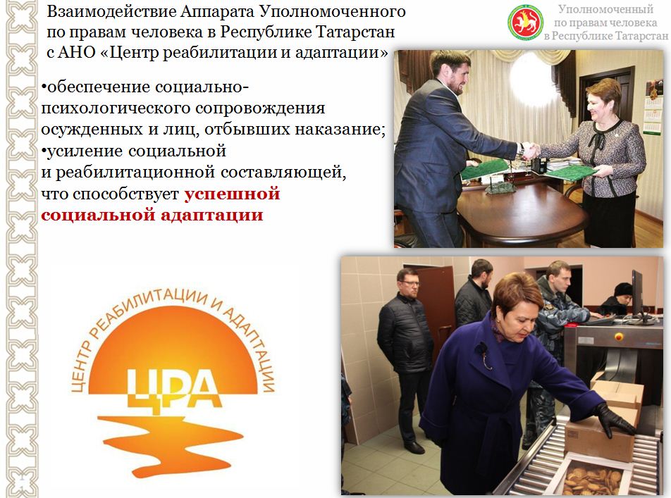 Уполномоченный находится в тесном взаимодействии с АНО «ЦРА», которая путем консолидации взяла на себя такие функции как обеспечение социально-психологического сопровождения осужденных и лиц, отбывших наказание, усиление социальной и реабилитационной составляющей, что способствует успешной социальной адаптации таких граждан. Уполномоченный по правам человека в Республике Татарстан и сотрудники его Аппарата принимают участие в проводимых АНО «ЦРА» мероприятиях, в частности благотворительных акциях в исправительных учреждениях Республики Татарстан. Так, неоднократно проходили благотворительные акции в филиале «Больница» ФКУЗ «Медико-санитарная часть» № 16 ФСИН России (ФКУ ИК-2 УФСИН России по Республике Татарстан), в рамках которых осуществлялась поставка гуманитарной помощи в виде сухофруктов, булочно-кондитерских изделий и чая для осужденных, находящихся на лечении в стационаре..jpg)