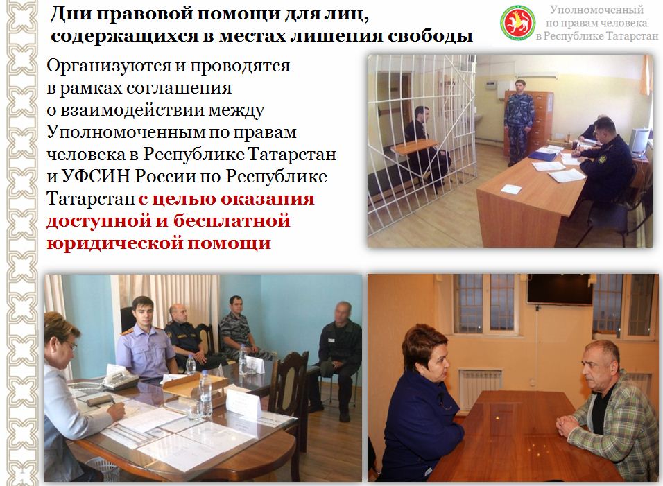 В своем выступлении Уполномоченный осветила тему содействия правовому просвещению в области прав и свобод человека и гражданина и оказания доступной и бесплатной юридической помощи лицам, содержащимся в исправительных учреждениях УФСИН России по Республике Татарстан. В августе 2015 года Уполномоченным была введена новая форма интерактивной работы с заявителями - проведение Дней правовой помощи в исправительных учреждениях УФСИН России по Республике Татарстан.