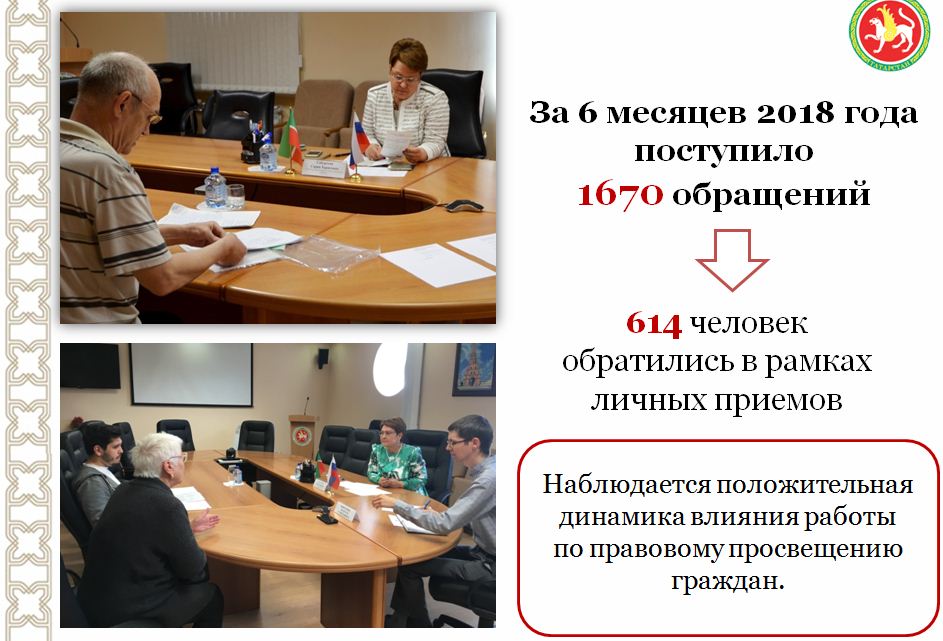 За отчетный период в Аппарат Уполномоченного по правам человека в Республике Татарстан поступило 1670 обращений граждан, в том числе в рамках личного приема Уполномоченным и сотрудниками Аппарата принято 614 человек.