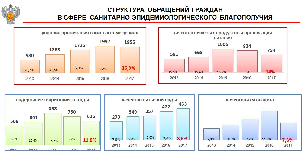 Как показывает анализ обращений граждан за 2017 год, наиболее актуальными жалобами в области санитарно-эпидемиологического благополучия являются: условия проживания в жилых помещениях - 36,3%; качество пищевых продуктов, продовольственного сырья и организации питания - 14%;содержание территорий городских и сельских поселений, сбор, хранение отходов производства и потребления – 11,8%; качество питьевой воды и питьевого водоснабжения – 8,6%;качество атмосферного воздуха в городских и сельских поселениях, на территориях промышленных организаций и т.д. – 7,6%.