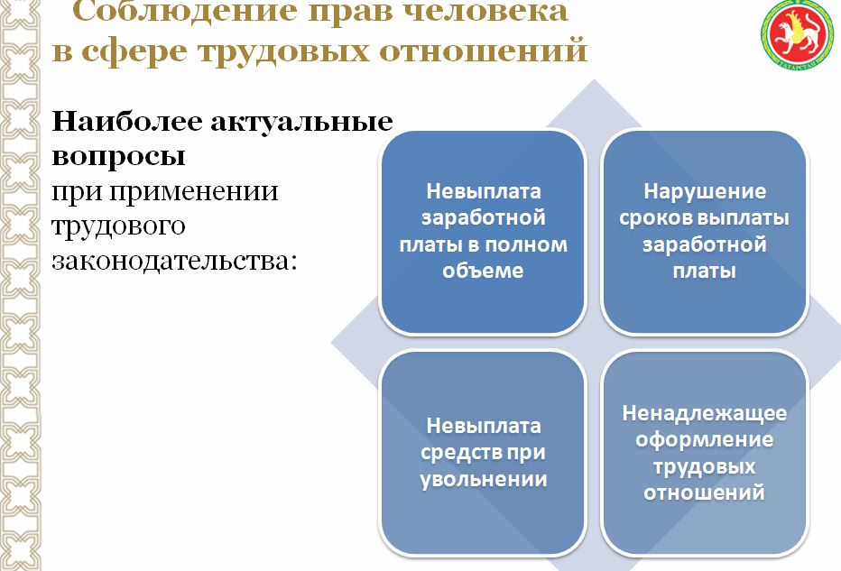 И как показывает практика, число жалоб в сфере трудовых отношений, поступающих в Аппарат Уполномоченного по правам человека в Республике Татарстан, каждый год заметно уступает разве что числу жалоб о нарушениях жилищных прав.