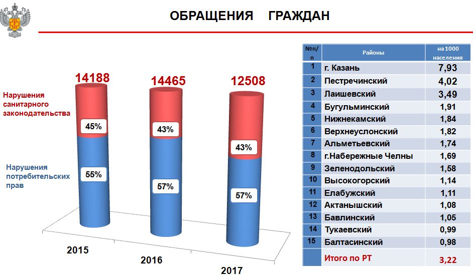 Впервые за 3 года отмечается снижение поступивших обращений на 13,5%, но их число остается все же значительным – 12,5 тысяч. Наибольшее количество обращений поступило от жителей Казани, Пестречинского и Лаишевского районов.