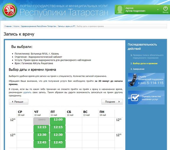 Электронная услуга позволяет записываться на прием к врачу через Портал государственных и муниципальных услуг Республики Татарстан, терминалы электронной очереди, инфоматы «Электронный Татарстан», мобильное приложение «Услуги РТ». Самым популярным при этом традиционно остается Портал государственных и муниципальных услуг Республики Татарстан – с начала года через него оформлено 1,3 млн записей к врачу.