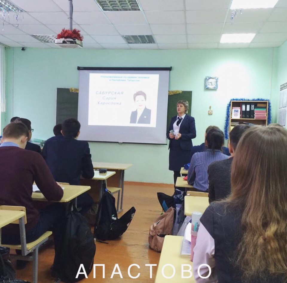 Уполномоченный по правам человека в Республике Татарстан Сария Сабурская провела Единый урок прав человека в школе с.Пестрецы, рассказав учащимся о роли Всеобщей декларации прав человека, Конституции Российской Федерации, 25-летие принятия которой празднуется в 2018 году, системе прав человека и гражданина, методах их защиты, поделилась опытом работы Уполномоченного по правам человека в Республике Татарстан.