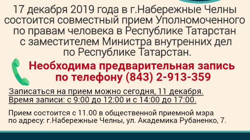 Желающим попасть на прием необходимо записаться 11 декабря по номеру: (843) 2-913-359. Время записи: с 9:00 до 12:00 и с 14:00 до 17:00.