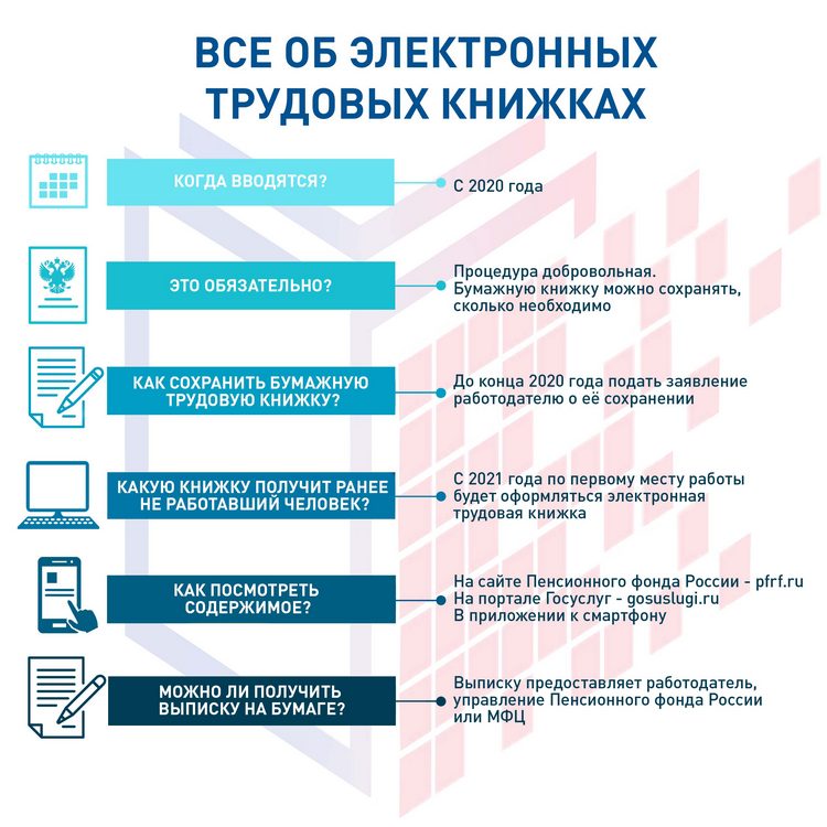 С 2020 года в России появится электронная трудовая книжка. Новый цифровой формат призван обеспечить постоянный и удобный доступ граждан к информации о своей трудовой деятельности, а работодателям – к новым возможностям кадрового учета. Переход на электронные трудовые книжки будет добровольным, позволяющим сохранить бумажный формат столько времени, сколько это необходимо. Исключением станут те граждане, кто устроится на работу впервые с 2021 года. У них все сведения о трудовой деятельности изначально будут вестись только в электронном виде без оформления бумажного носителя.