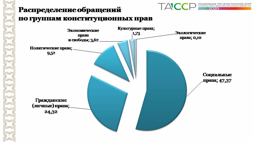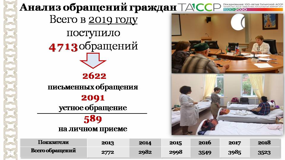 Количество обращений, поступивших непосредственно в Аппарат Уполномоченного по правам человека в Республике Татарстан, в 2019 году увеличилось более чем на тысячу и по итогам составило 4713. При этом структура обращений практически не изменилась. Большая их часть связана с трудовыми, жилищными отношениями, вопросами обеспечения права на охрану здоровья и медицинскую помощь, права на образование, права на предоставление мер социальной поддержки.
