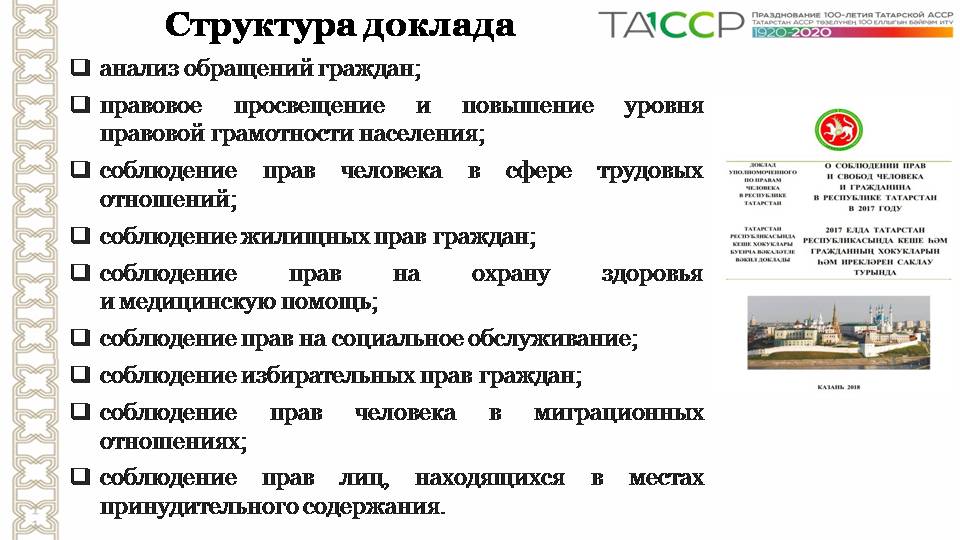 Доклад Уполномоченного «О соблюдении прав и свобод человека и гражданина в Республике Татарстан в 2019 году», подготовлен в соответствии со статьей 26 Закона Республики Татарстан от 3 марта 2000 года № 95 «Об Уполномоченном по правам человека в Республике Татарстан».