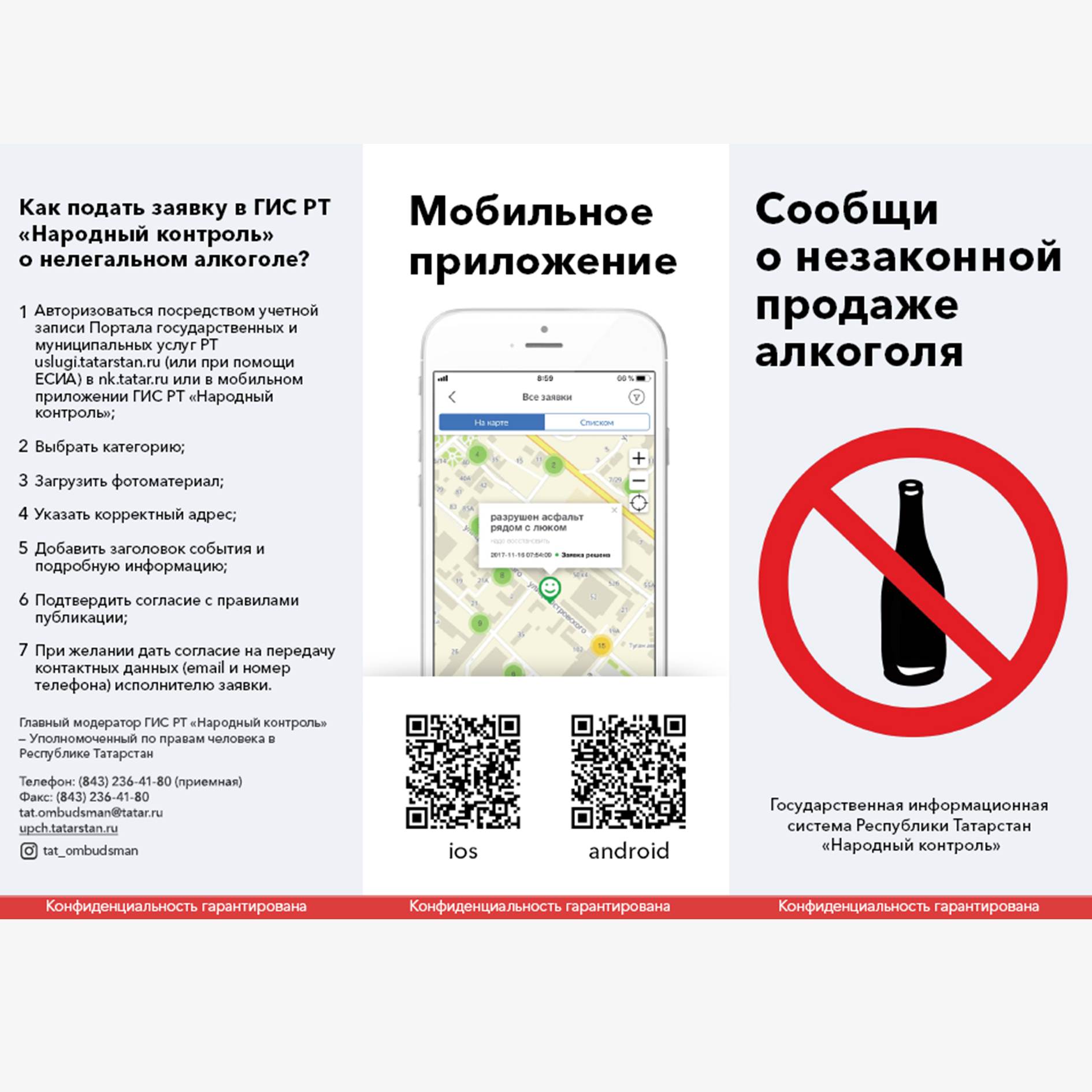 Хотелось бы напомнить, что в целях выявления нарушения законодательства в сфере производства и оборота этилового спирта, алкогольной и спиртосодержащей продукции на территории Республики Татарстан для граждан имеется возможность подачи уведомлений в ГИС РТ «Народный контроль».