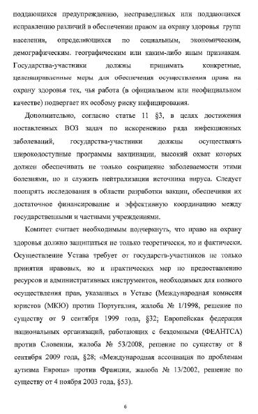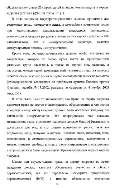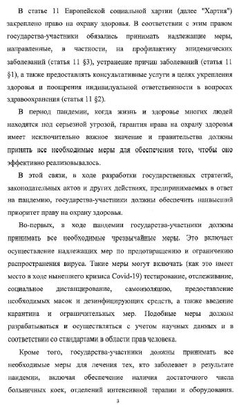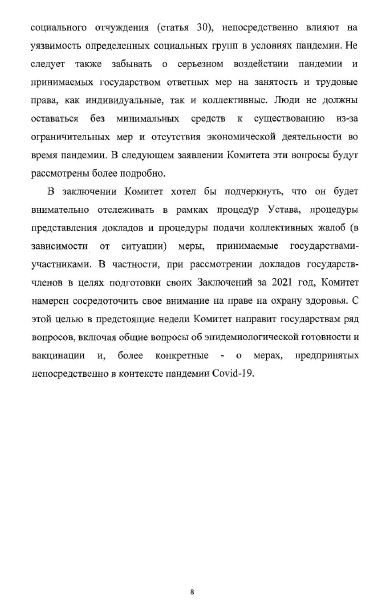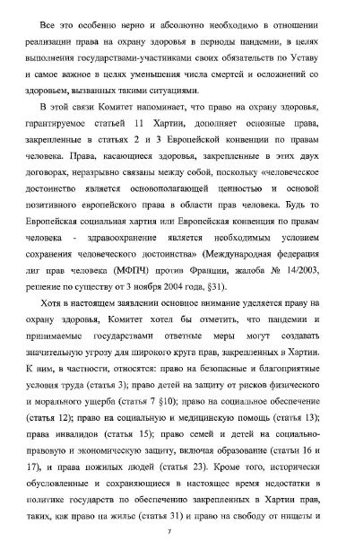 Европейский комитет по социальным правам (ЕКСП) выпустил заявление с комментарием относительно обеспечения права на охрану здоровья (статья 11 Европейской социальной хартии) во время пандемии. В своем заявлении Комитет одобряет значительное число мер реагирования на пандемию COVID-19, которые были приняты государствами: «тестирование и отслеживание, физическое дистанцирование и самоизоляция, предоставление надлежащих масок и дезинфицирующих средств, а также введение карантина и других изоляционных ограничений». «Все эти меры должны разрабатываться и осуществляться с учетом актуальных научных знаний и в соответствии с применимыми стандартами в области прав человека», ‒ говорится в заявлении.