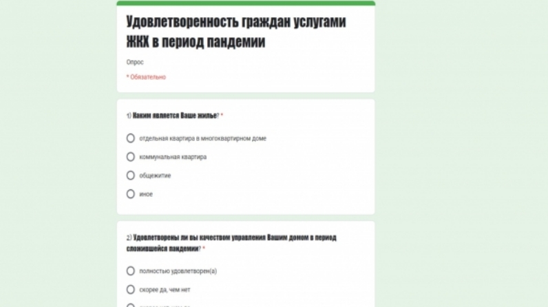 Опрос состоит из 13 пунктов, посвящённых качеству услуг ЖКХ в период самоизоляции. Вопросы включают такие проблемы как вывоз мусора, стоимость услуг и задолженности и санитарная обработка подъездов. Принять участие можно по перейдя по ссылке https://forms.gle/EiPhUaNHN5Vxxqbu5. По результатам анкетирования будет проведена пресс-конференция с оглашением настроений татарстанцев и аналитикой по наиболее острым вопросам.
