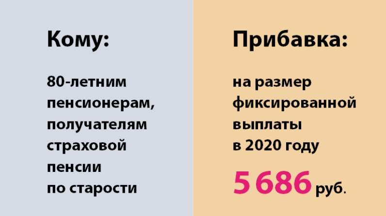 При достижении пенсионером 80-летнего возраста пенсия автоматически увеличивается на сумму фиксированной выплаты. С 1 января 2020 фиксированная выплата была проиндексирована и составляет 5686,25 руб.