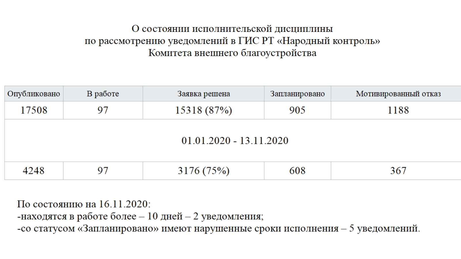На сегодняшний день доля решенных уведомлений по Комитету внешнего благоустройства г. Казани за 2020 год составляет – 75 %, что выше среднего показателя по г. Казани, однако, есть моменты, где вопросы остаются нерешенными, основная доля из которых связана с отсутствием освещения, благоустройством территории в парках и скверах.