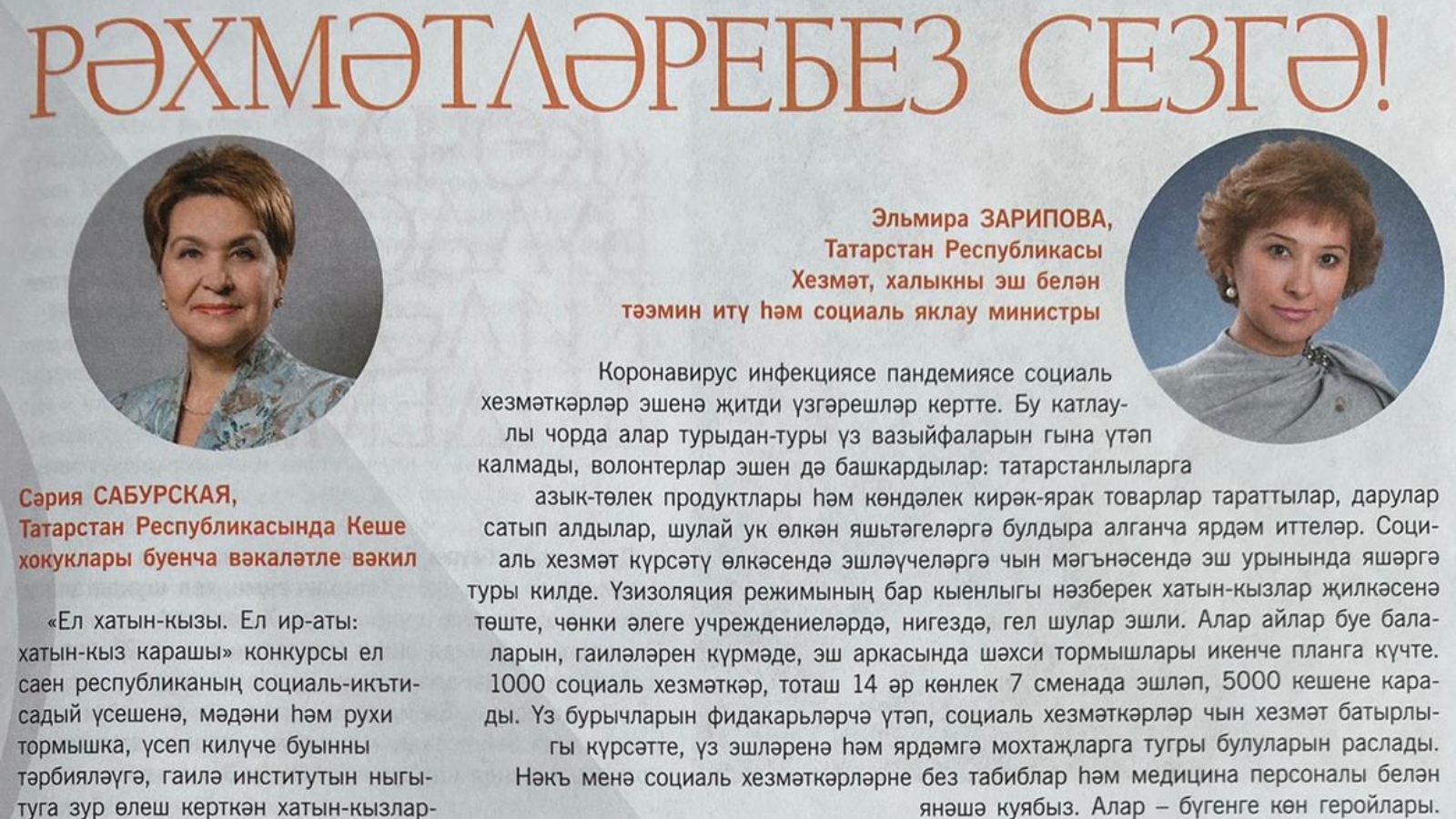 В мартовском выпуске журнала «Сөембикә» читайте интервью Уполномоченного по правам человека в Республике Татарстан интервью о Республиканском конкурсе «Женщина Года. Мужчина года: женский взгляд», который ежегодно представляет обществу татарстанцев, внесших значительный вклад в социально-экономическое развитие республики, в поддержку культуры, духовности, воспитание подрастающего поколения, укрепление института семьи.