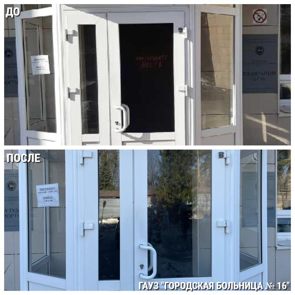 Также, проведены мероприятия по установке стекла в дверном проеме входной группы приема передач в родильном доме ГАУЗ «Городская больница №16». Уведомление было подано в систему в 2021 году. (№ 4006329) (2).jpeg)