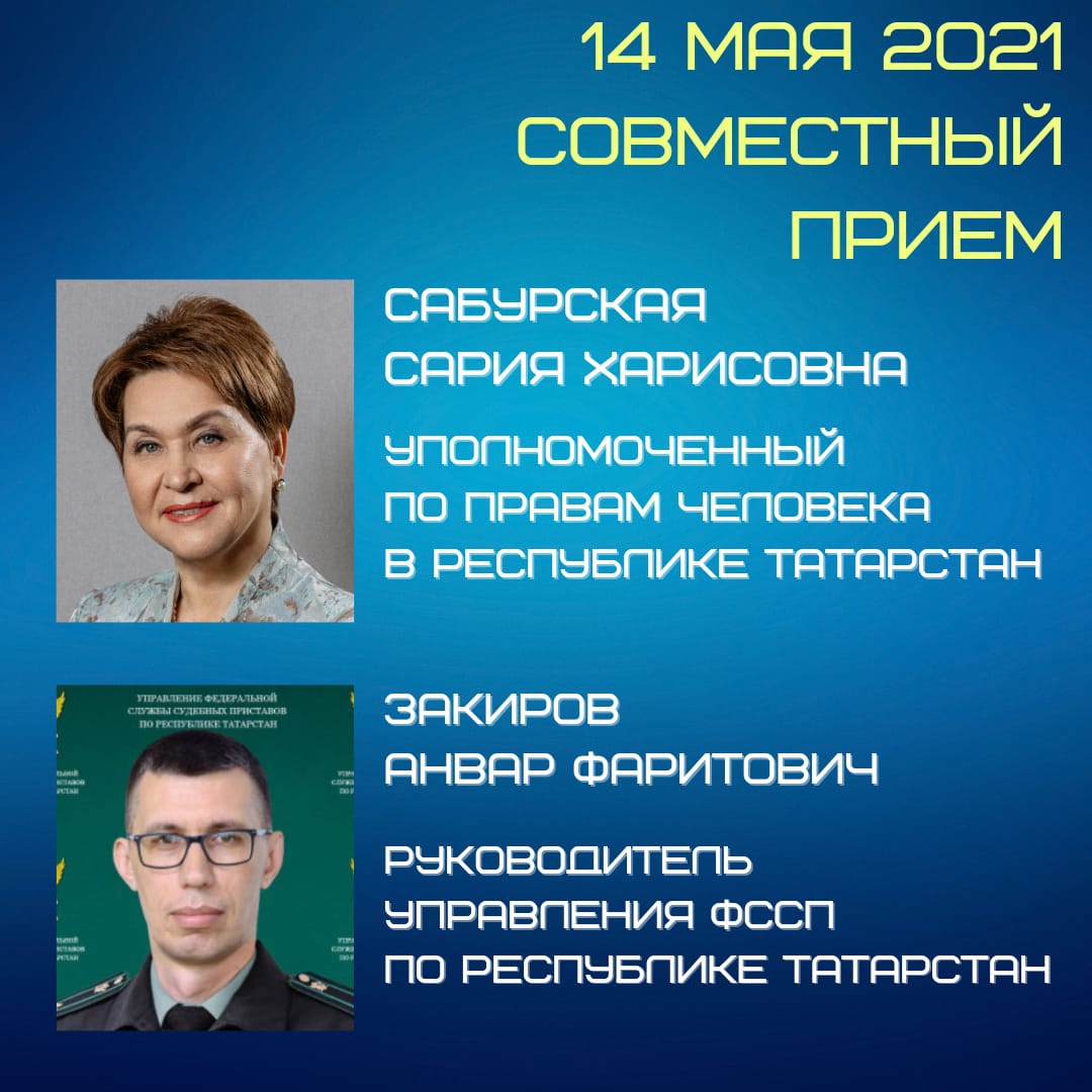 Совместный прием граждан по вопросам исполнительного производства состоится в Аппарате Уполномоченного по правам человека в Республике Татарстан 14 мая 2021 года по адресу: ул. Карла Маркса, д. 61.