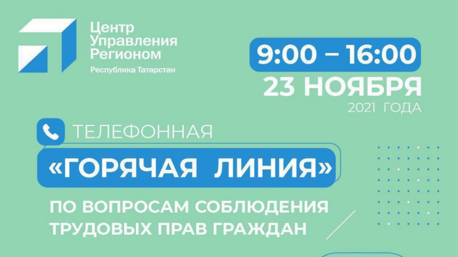 23 ноября 2021 года Уполномоченный по правам человека в Республике Татарстан совместно с Государственной инспекцией труда в Республике Татарстан и Федерацией профсоюзов Республики Татарстан проводят телефонную «горячую линию» по вопросам соблюдения трудовых прав граждан.