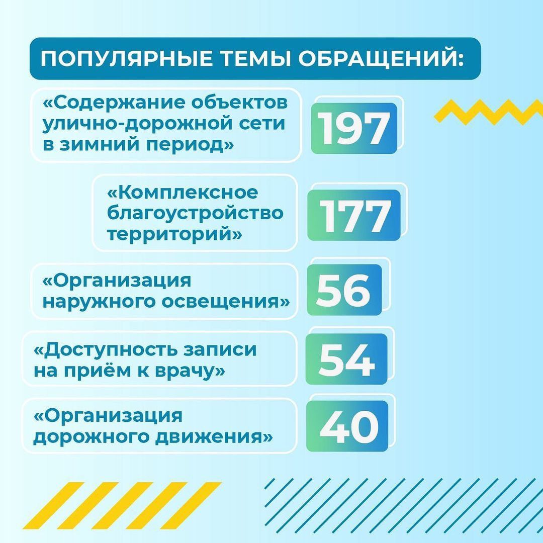 Пользователи системы активнее всего подавали (передано в работу) уведомления по категориям: «Содержание объектов улично-дорожной сети в зимний период» (197 уведомлений), «Комплексное благоустройство территории» (177 уведомлений), «Организация наружного освещения» (56 уведомлений), «Доступность записи на прием к врачу» (54 уведомления), «Организация дорожного движения» (40 уведомлений).