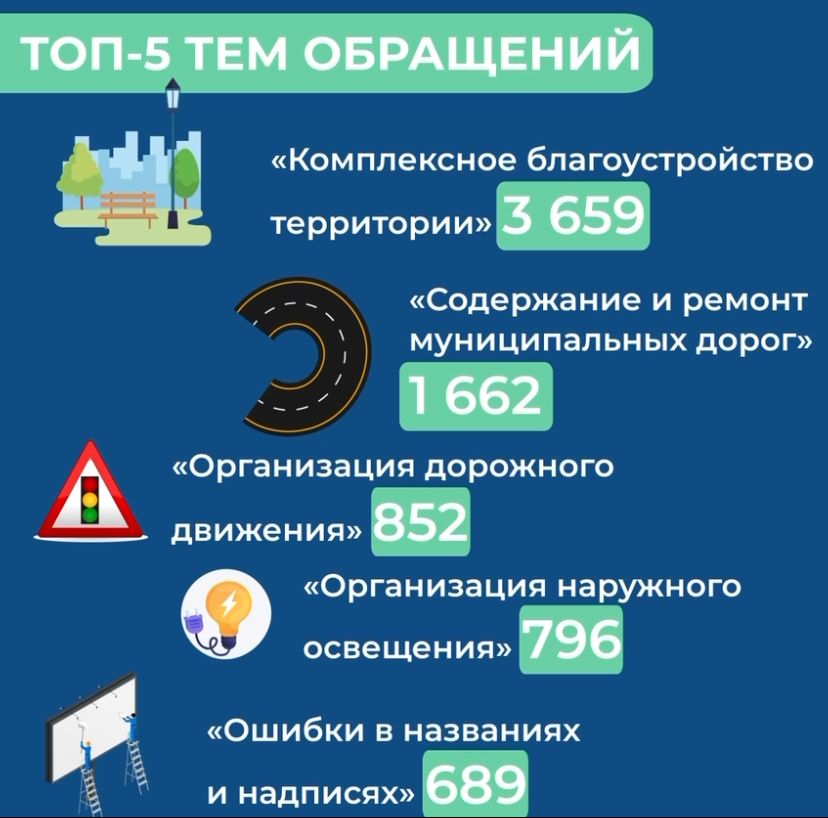 Наибольший интерес граждан в ноябре текущего года вызвали вопросы по категориям «Комплексное благоустройство территории» – 3 659 уведомлений, «Содержание и ремонт муниципальных дорог» – 1 662 уведомления, «Организация дорожного движения» – 852 уведомления, «Организация наружного освещения» – 796 уведомлений, «Ошибки в названиях и надписях» – 689 уведомлений.