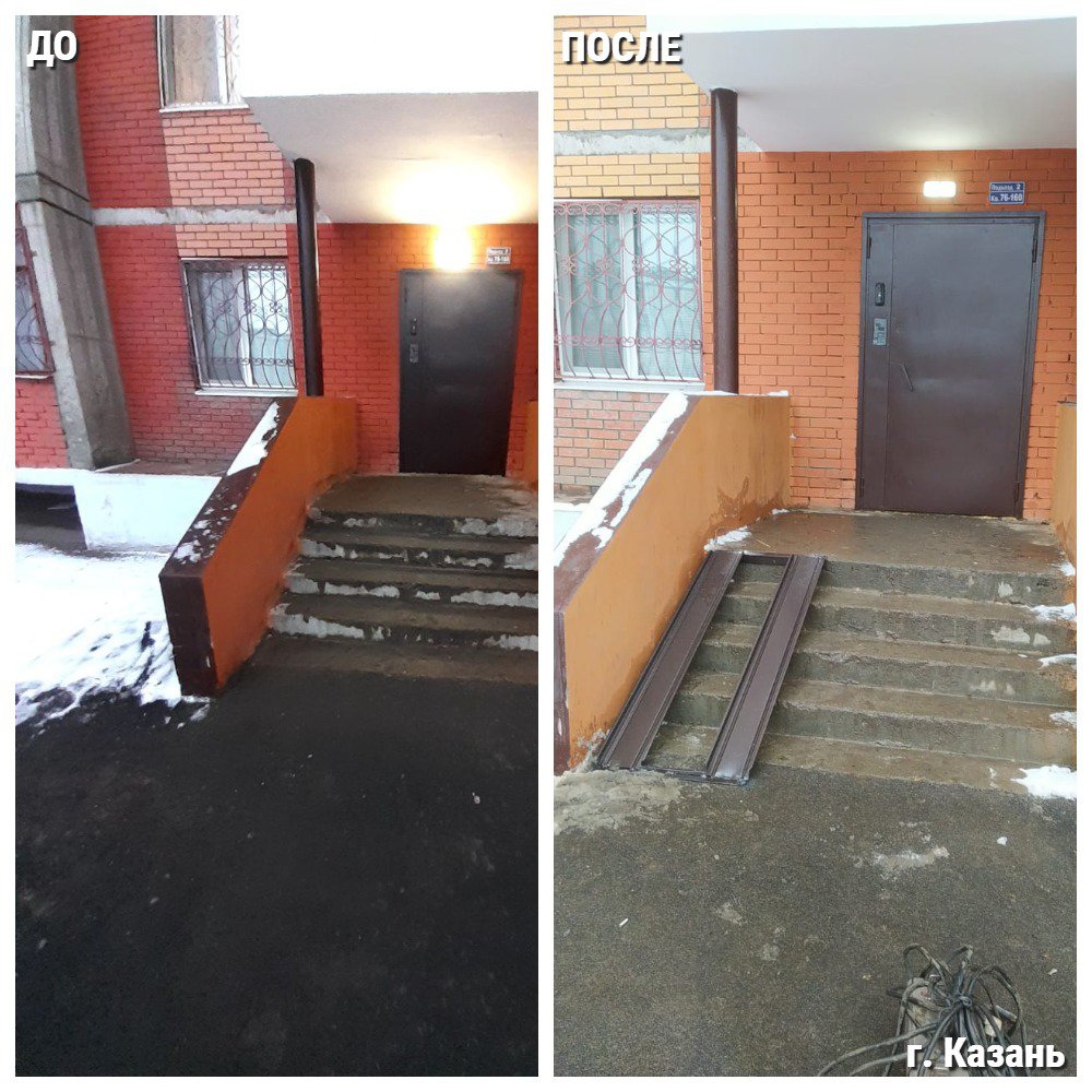 Администрацией Советского района Казани в рамках организации доступной среды для маломобильных групп населения установлен пандус в подъезде в доме по Проспекту Победы (№ 4470034).