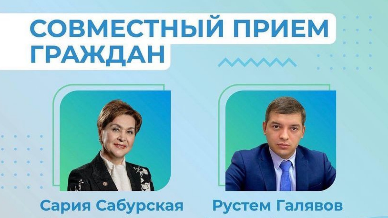 Жителям республики, желающим обратиться к Сарие Сабурской и Рустему Галявову необходимо заранее записаться по телефону (843) 236-41-80 и к назначенному времени прийти в приемную Общественного помощника Уполномоченного либо в Аппарат Уполномоченного по правам человека в Республике Татарстан.