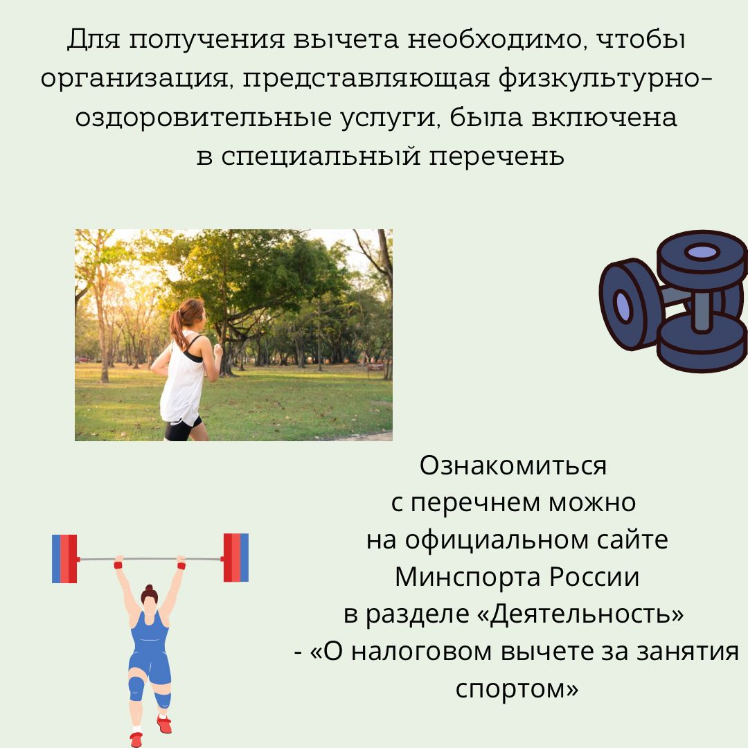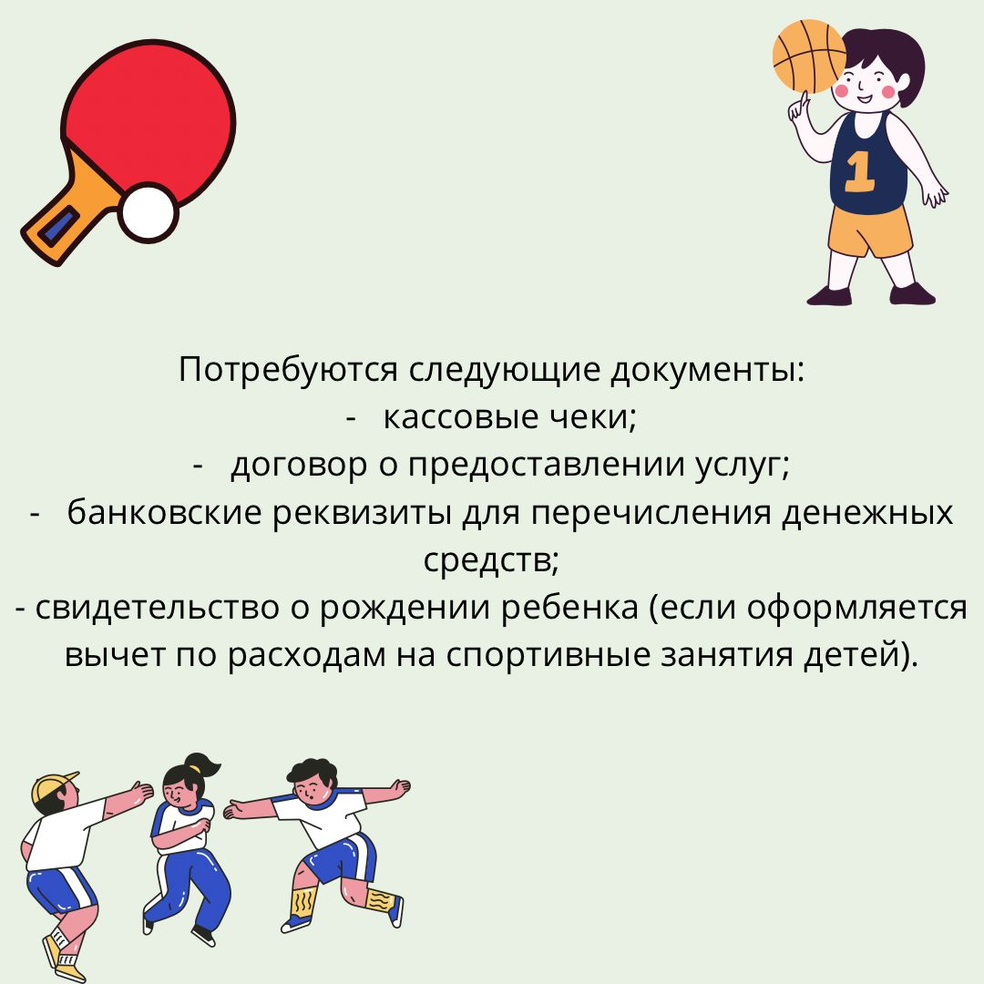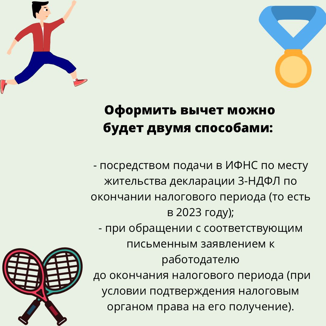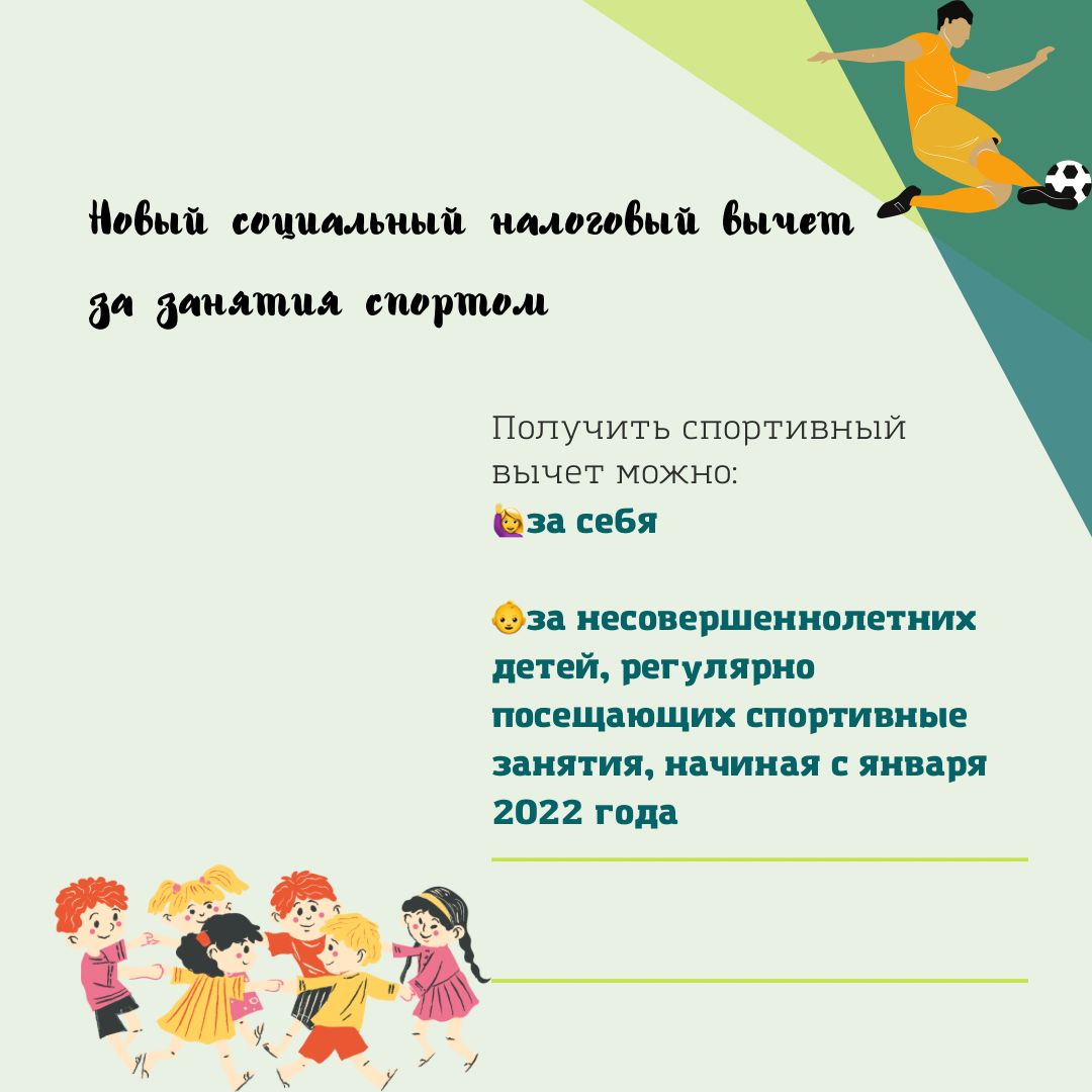 Рассказываем о новом социальном налоговом вычете за занятия спортом. Получить спортивный вычет можно не только за себя, но и за несовершеннолетних детей, регулярно посещающих спортивные занятия, начиная с января 2022 года. Необходимо отметить, что этот вычет предоставляется не отдельно, а в совокупности с другими социальными вычетами (на лечение, обучение самого налогоплательщика и др.).
