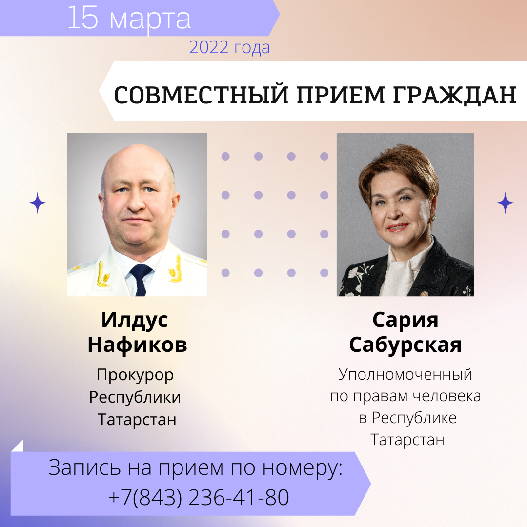 15 марта 2022 года с 14.00 до 16.00 в Аппарате Уполномоченного по правам человека в Республике Татарстан (г.Казань, ул.Карла Маркса, д.61) состоится совместный прием граждан Уполномоченным по правам человека в Республике Татарстан и прокурором Республики Татарстан @tatarstanproc (Instagram).