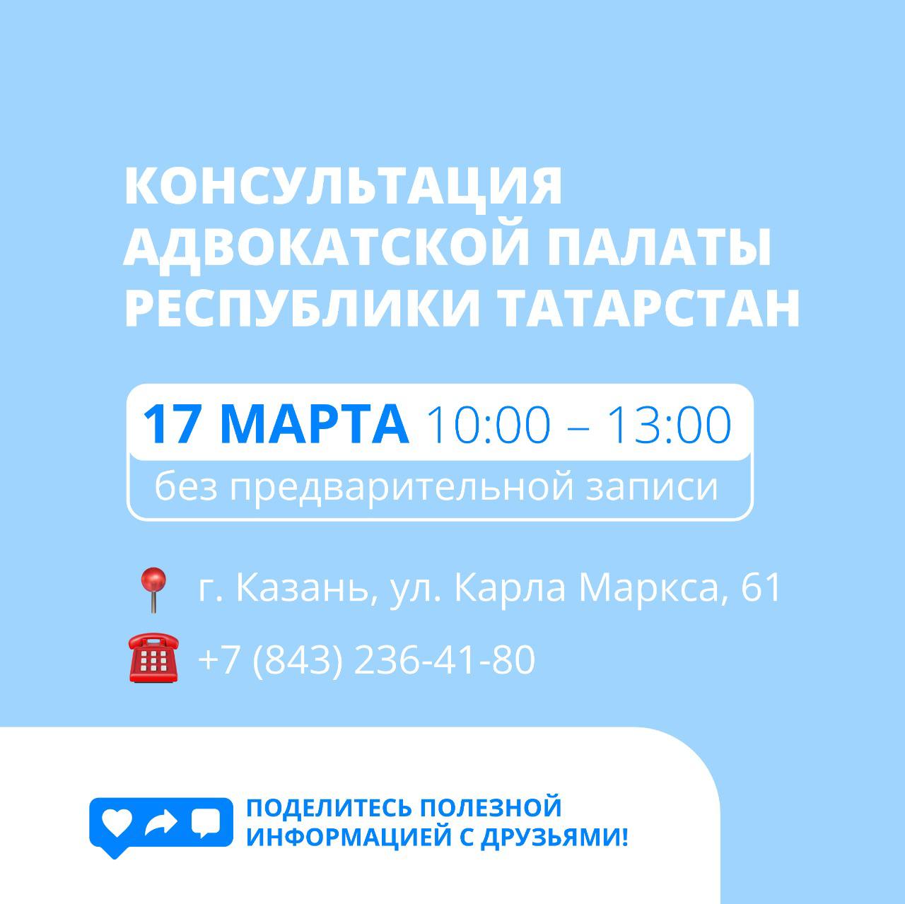 17 марта граждане смогут проконсультироваться по интересующим их вопросам с представителями Адвокатской палаты Республики Татарстан.