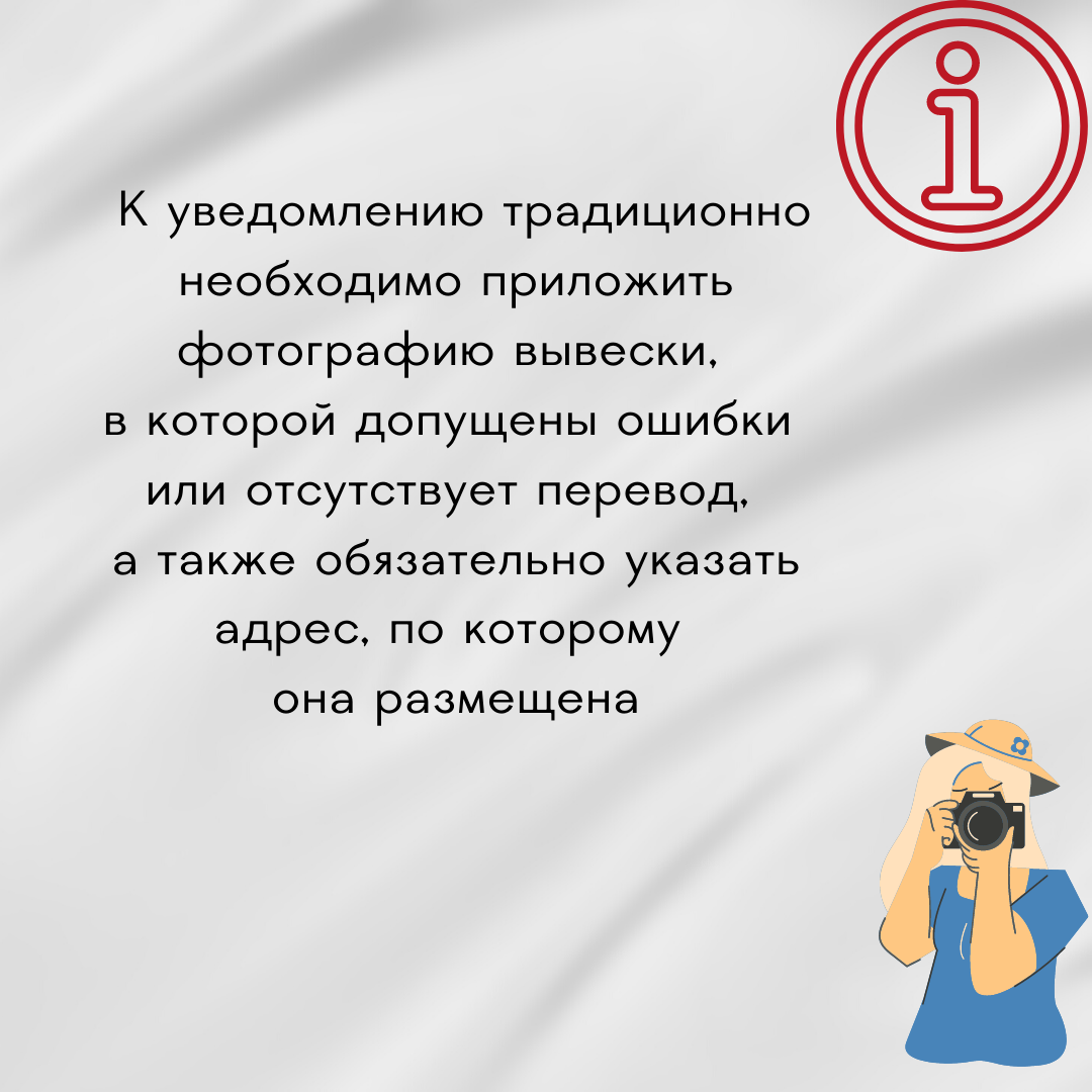 К уведомлению традиционно необходимо приложить фотографию вывески, в которой допущены ошибки или отсутствует перевод, а также обязательно указать адрес, по которому она размещена.