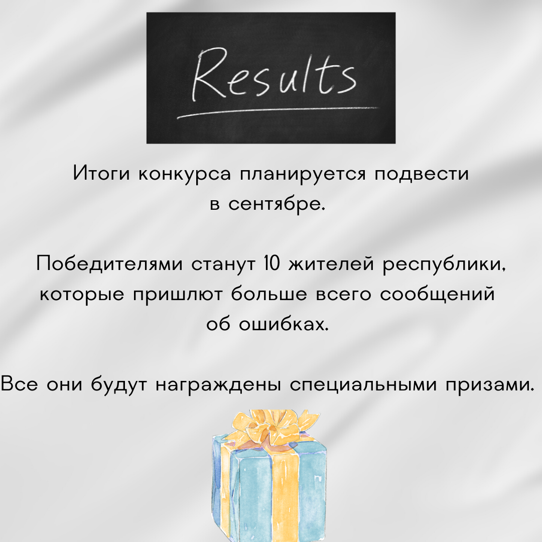 Итоги конкурса планируется подвести в сентябре. Победителями станут 10 жителей республики, которые пришлют больше всего сообщений об ошибках. Все они будут награждены специальными призами.