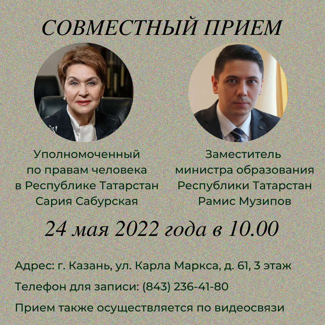 24 мая 2022 года с 10.00 до 12.00 в Аппарате Уполномоченного по правам человека в Республике Татарстан (г.Казань, ул.Карла Маркса, д.61) состоится совместный прием граждан Уполномоченным по правам человека в Республике Татарстан и заместителем министра образования и науки Республики Татарстан - руководителем департамента надзора и контроля в сфере образования Министерства образования и науки Республики Татарстан.