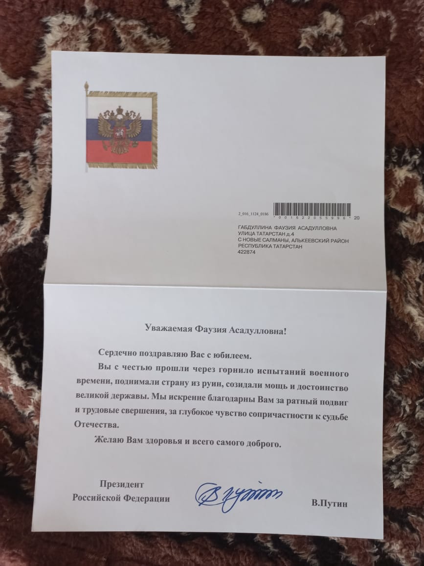 В Алькеевском муниципальном районе Республики Татарстан в июне 2022 года персональное поздравление Президента Российской Федерации В. В. Путина получила жительница села Новые Салманы Габдуллина Фаузия Асадулловна— труженица тыла, ветеран труда.