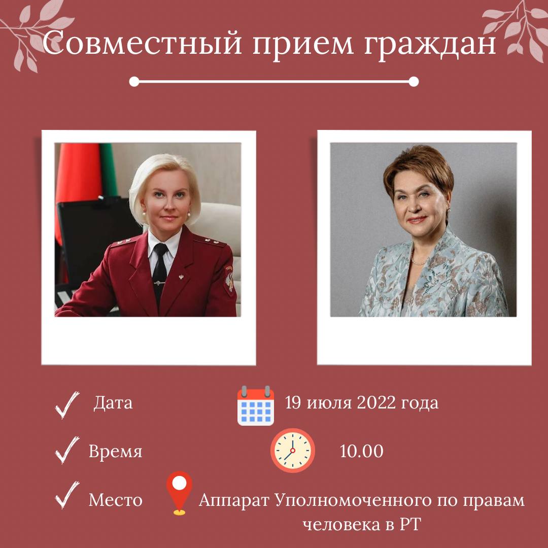 Уполномоченный по правам человека в Республике Татарстан Сария Сабурская и руководитель Управления Федеральной службы по надзору в сфере защиты прав потребителей и благополучия человека по Республике Татарстан (Татарстан) Марина Патяшина проведут совместный прием граждан в г.Казань.