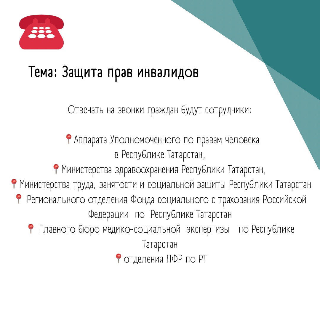 09 декабря 2022 года в рамках Декады инвалидов Уполномоченный по правам человека в Республике Татарстан проводит «горячую линию» по вопросам соблюдения прав инвалидов и людей с ограниченными возможностями здоровья.
