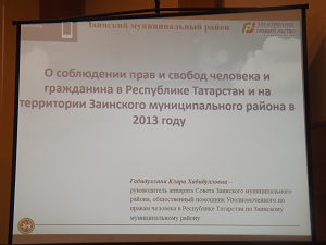 Общественный помощник Уполномоченного по правам человека в Республике Татарстан в Заинском районе Клара Габидуллина также выступила на заседании Заинского районного совета с информацией о соблюдении прав и свобод человека и гражданина в Республике Татарстан в 2013 году и на территории района.